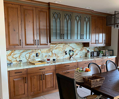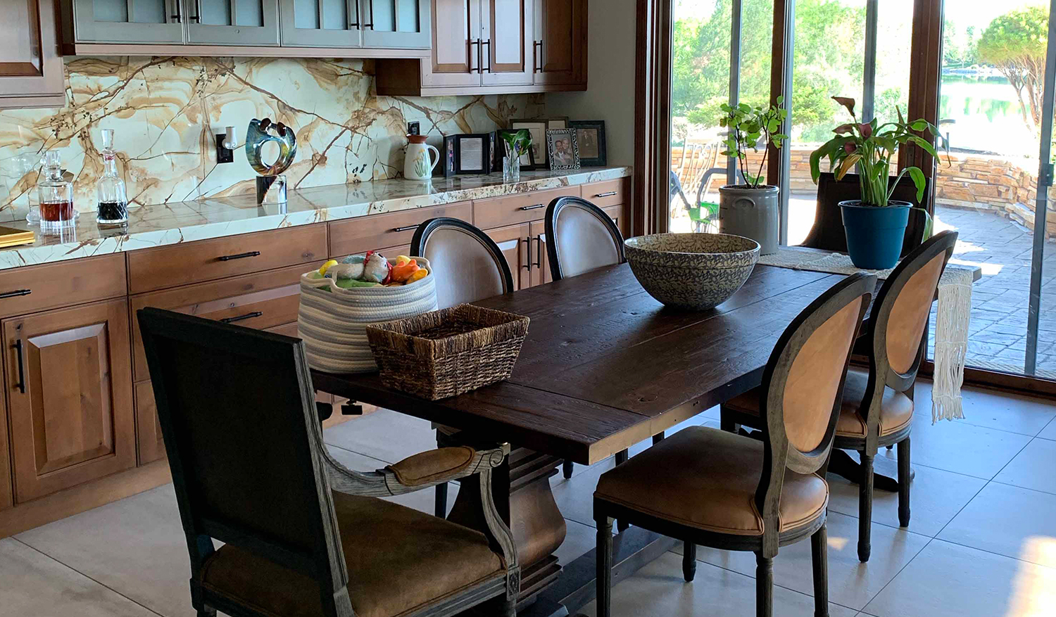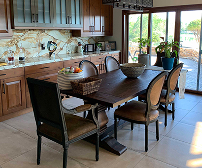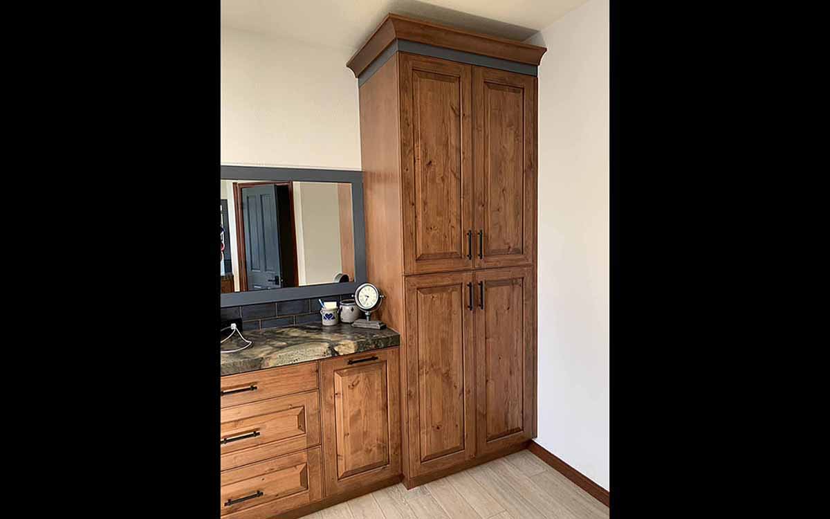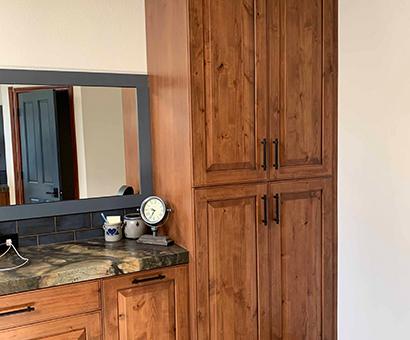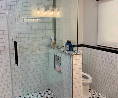 This renovation has a Traditional Style with a Mountain Rustic flair. The granite and cabinet wood tones blend together for a warm and elegant look. The Guest Bath has an European style with a bit of Industrial feel. We created this by using black and white marble mosaic tiles on the floor with classic white subway tile for the shower walls. We added accents including black hardware and a barn door slider help to give the space and industrial theme.
