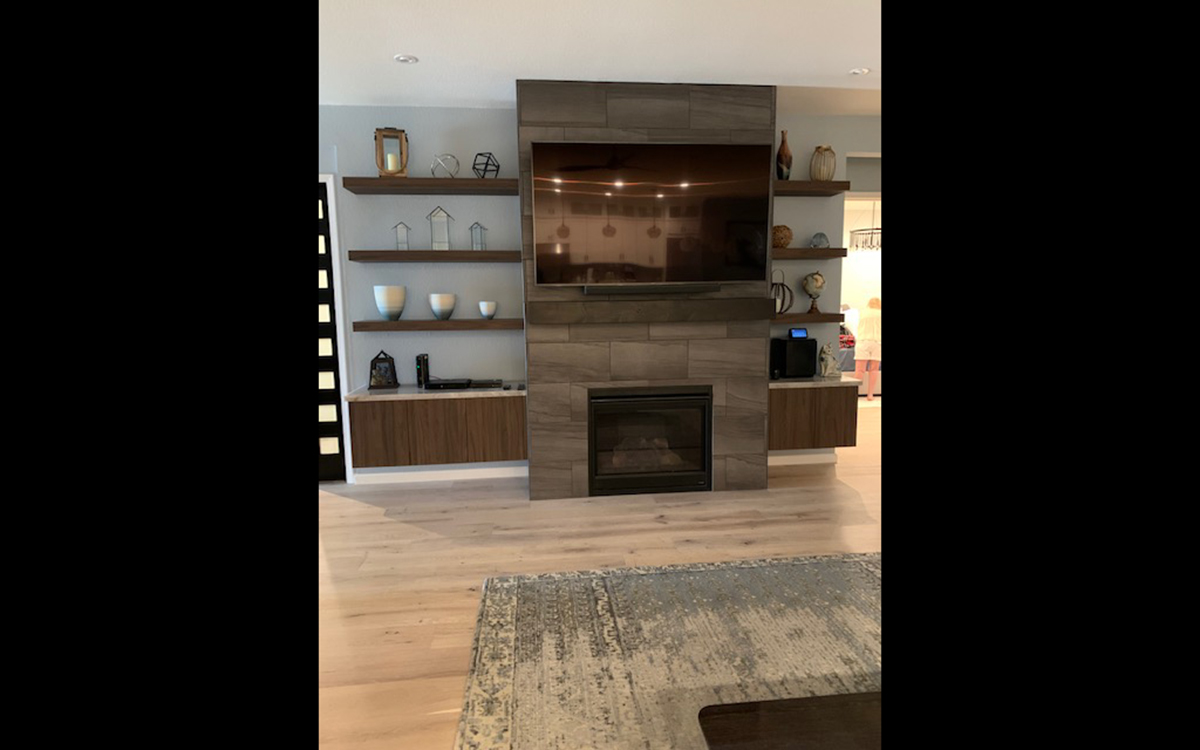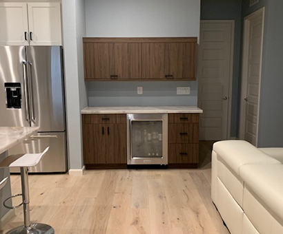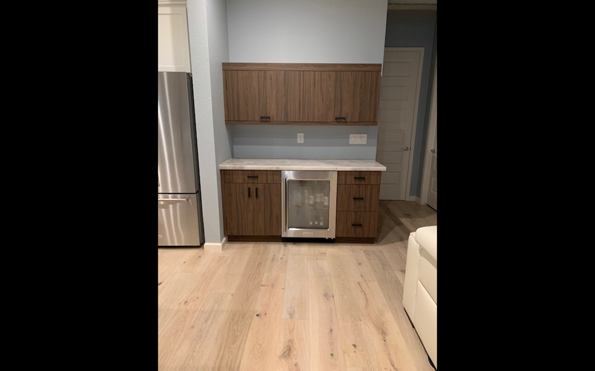 The cabinets are vertical grain walnut looking laminate which gives the clean but rich feel of wood. The modern flat panel doors along with the floating shelves and base cabinets are used to complete the mid-century theme.