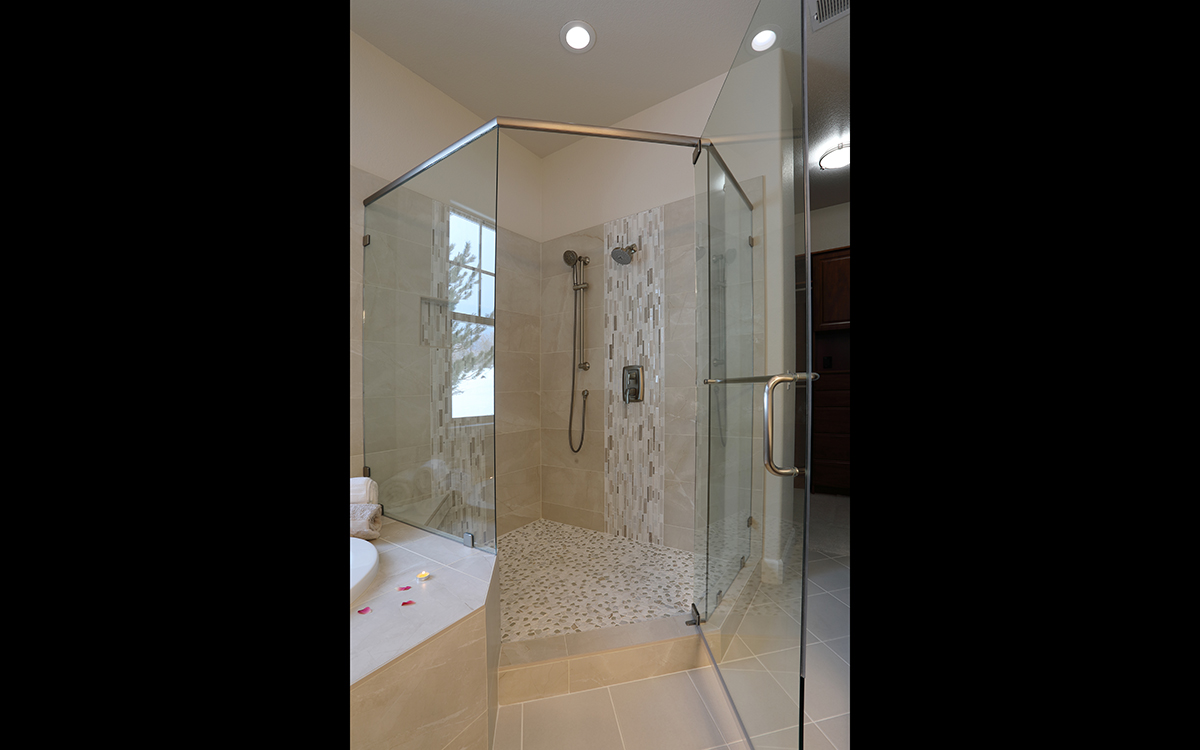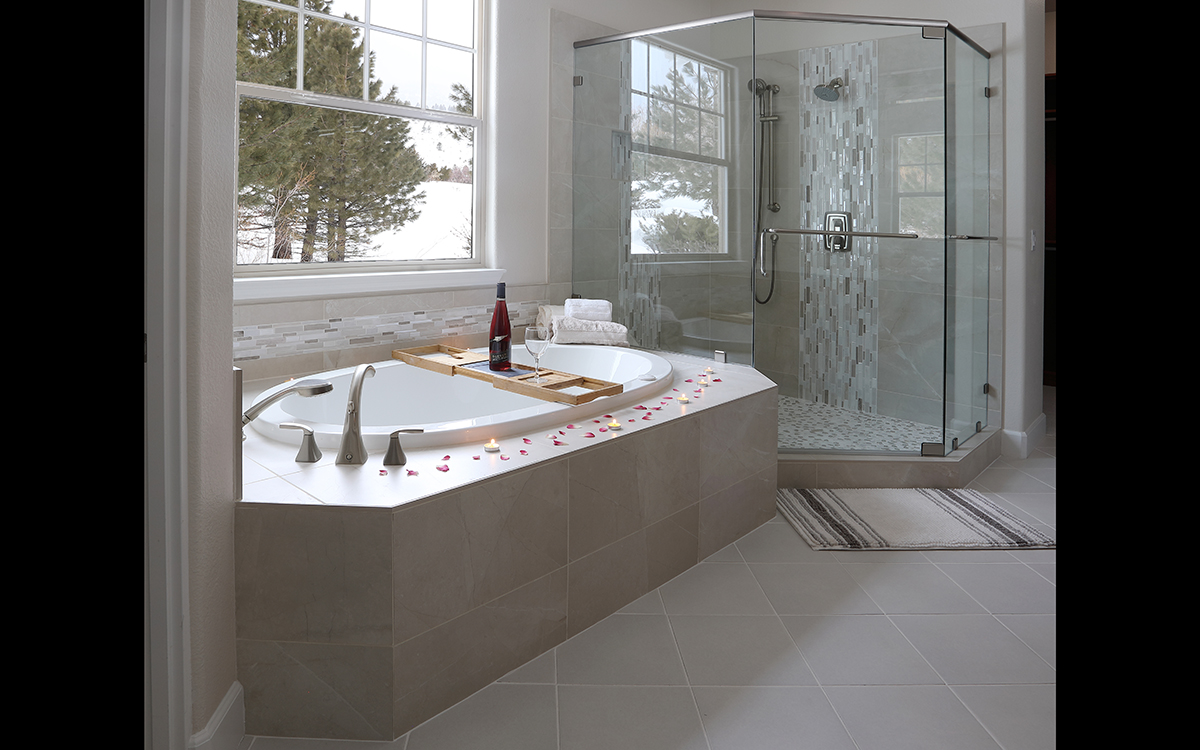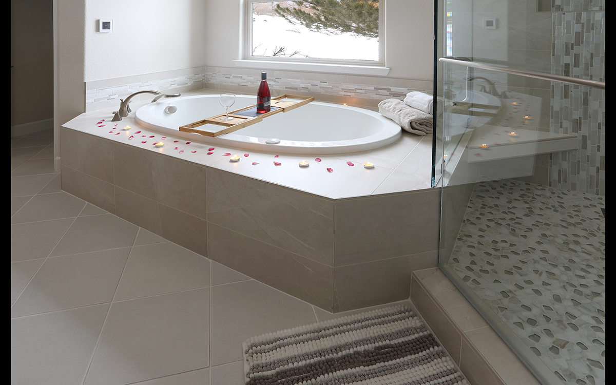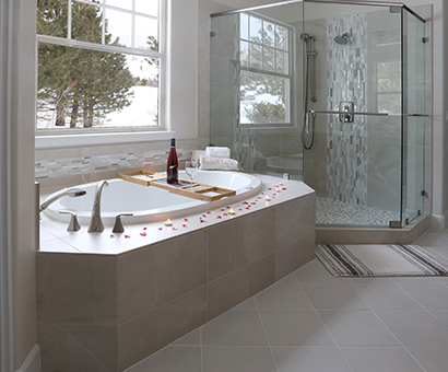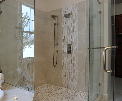 This spa-like bathroom is designed using soothing neutral colors along with elegant marble & glass mosaics and ceramic tiles throughout the shower and tub surround. The rich cherry wood vanity cabinets are finished with a sophisticated porcelain which completes the luxurious space.