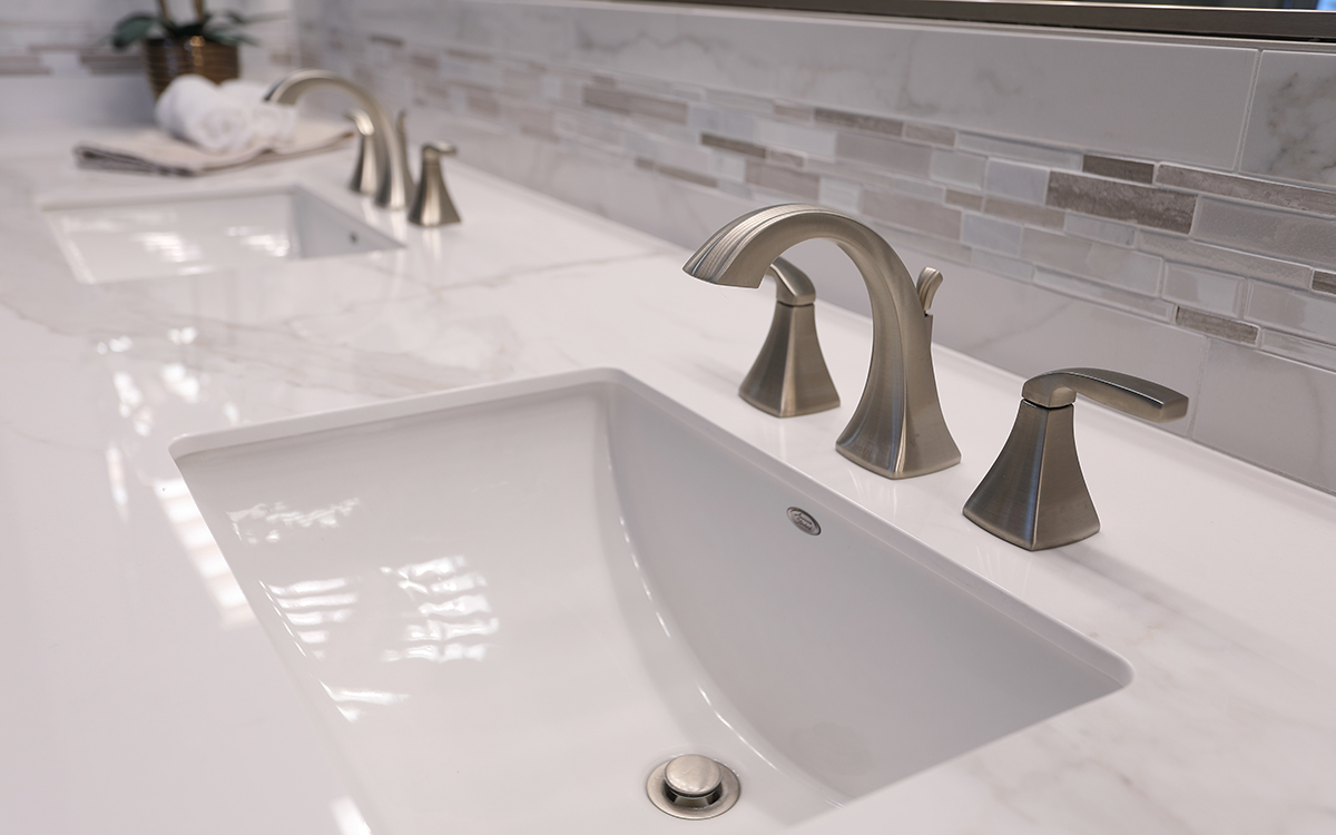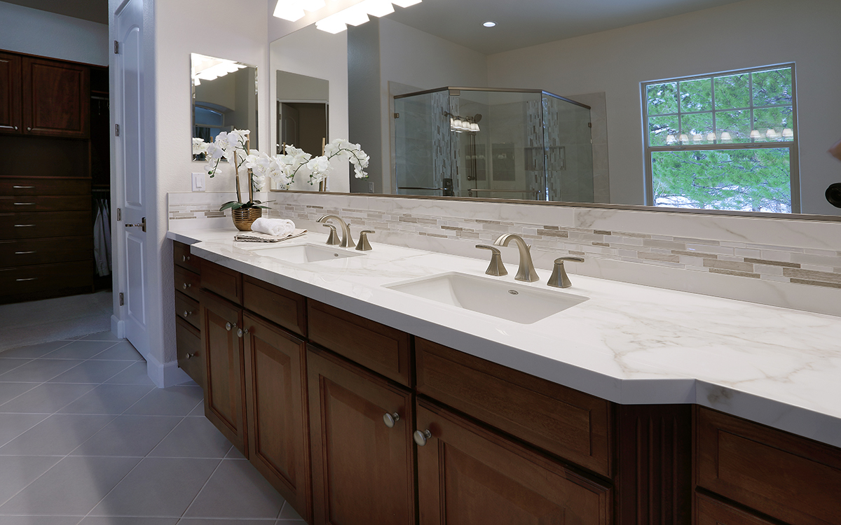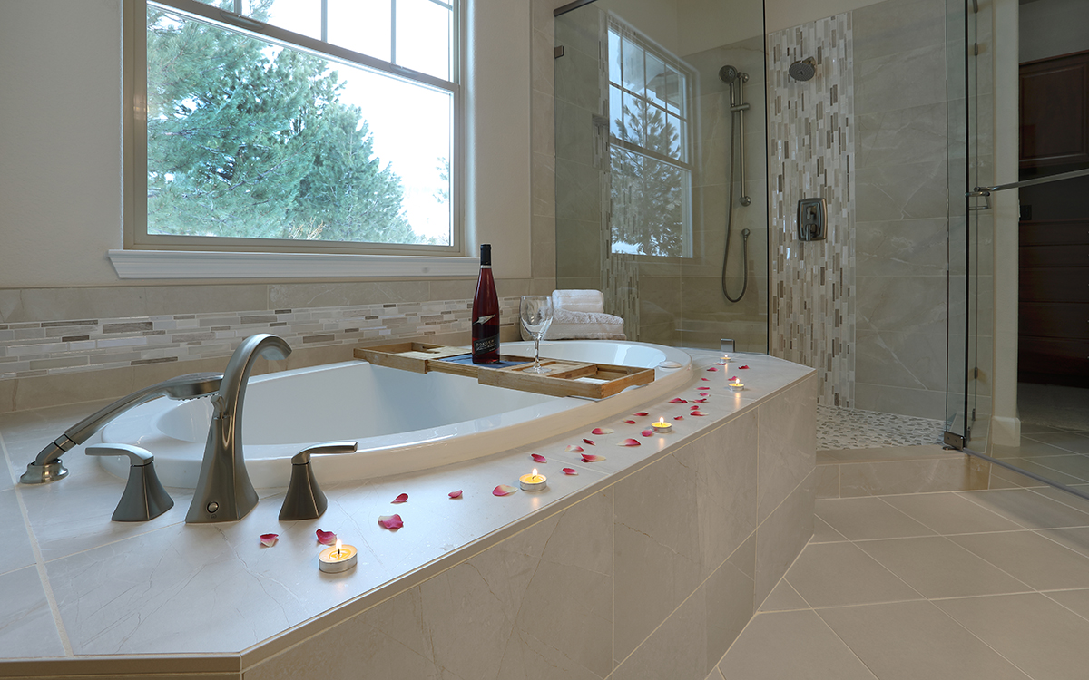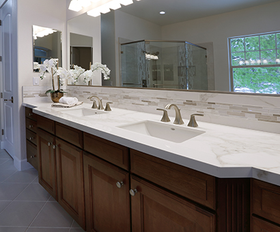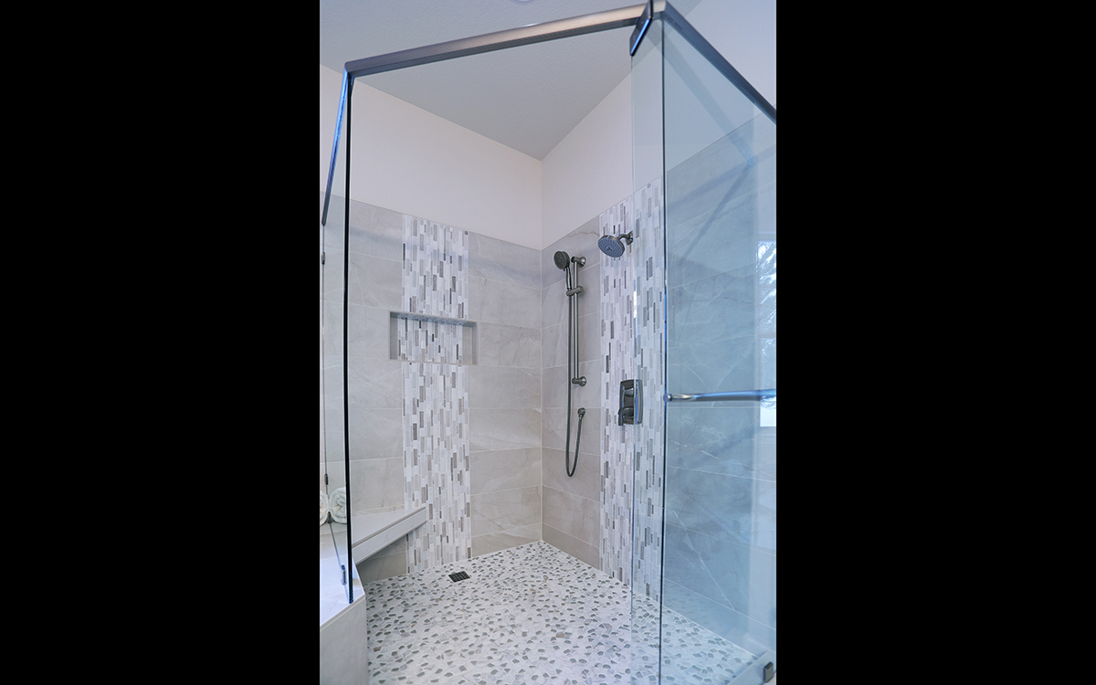 This spa-like bathroom is designed using soothing neutral colors along with elegant marble & glass mosaics and ceramic tiles throughout the shower and tub surround. The rich cherry wood vanity cabinets are finished with a sophisticated porcelain which completes the luxurious space.
