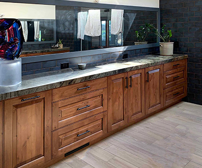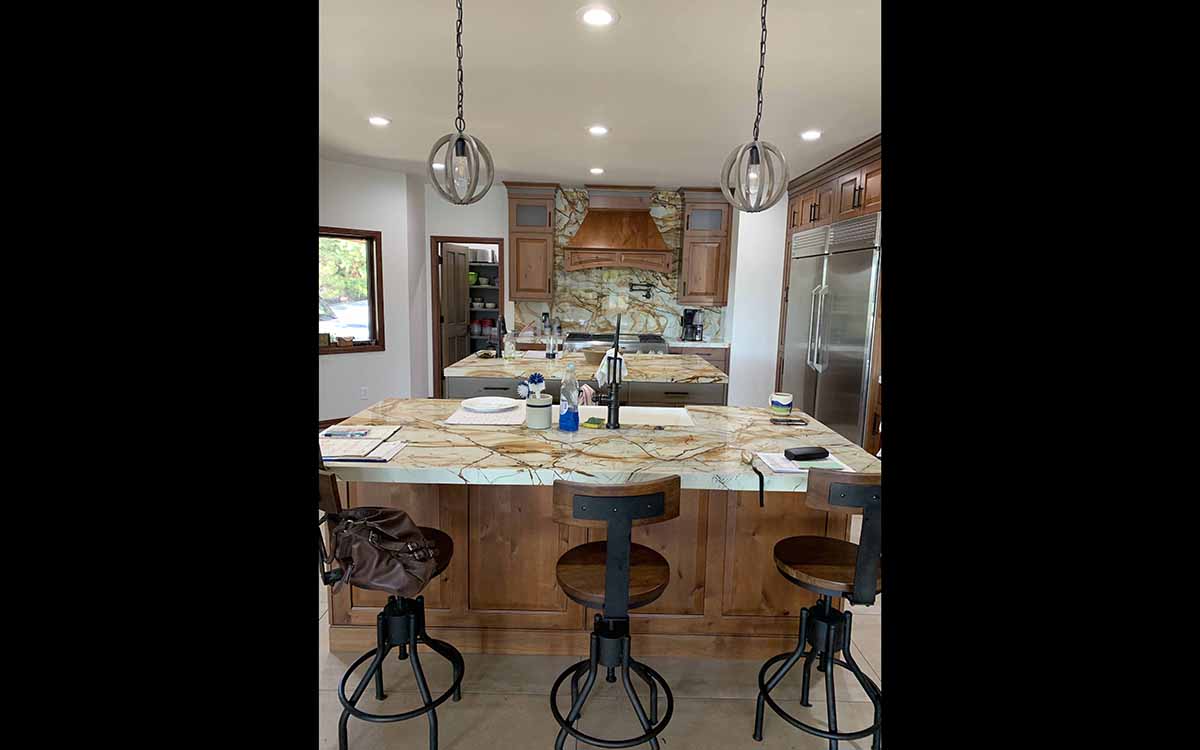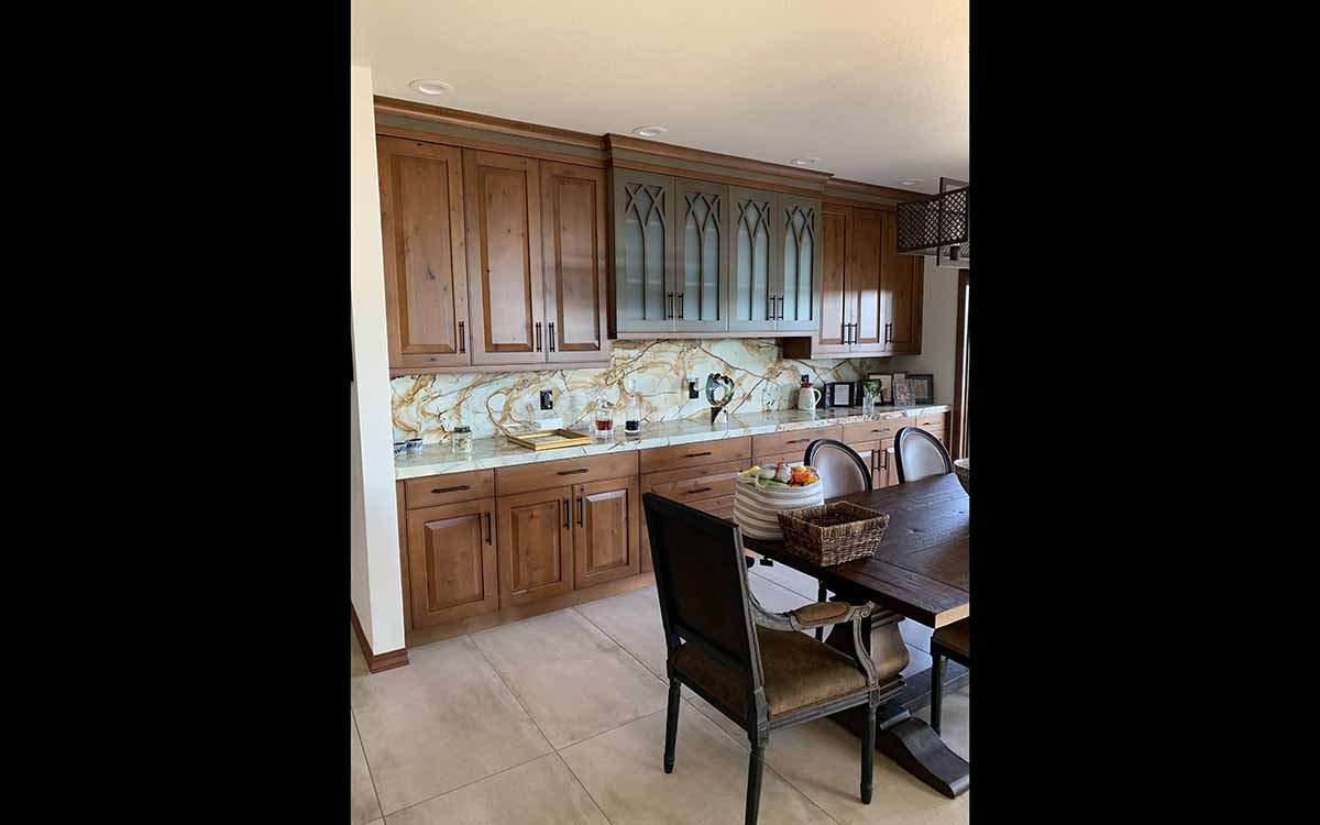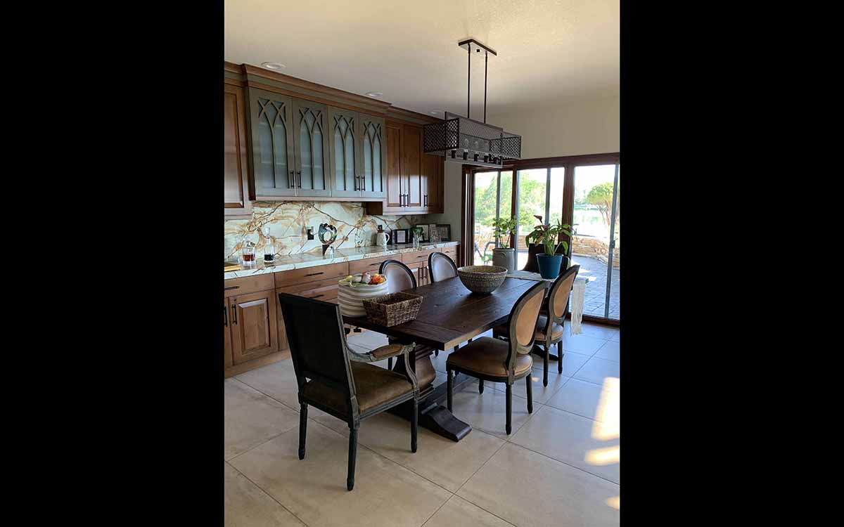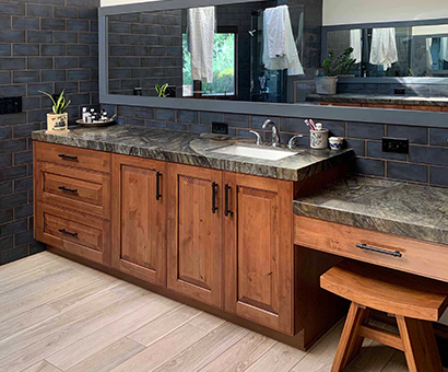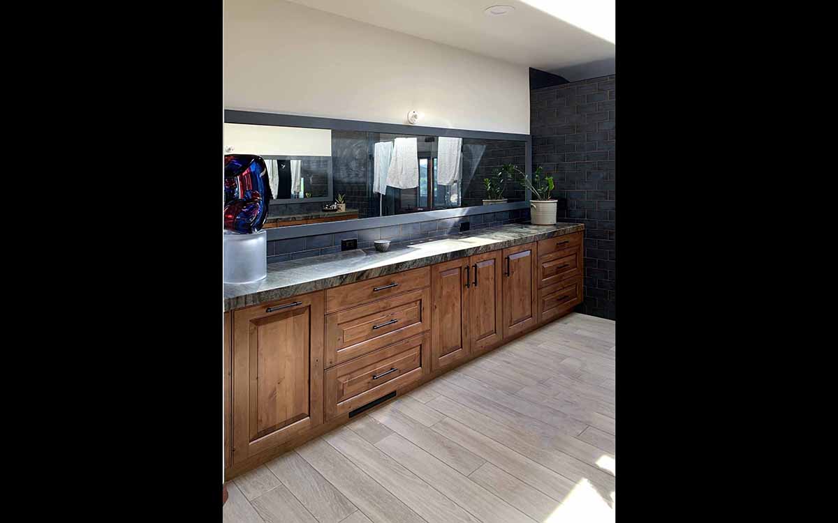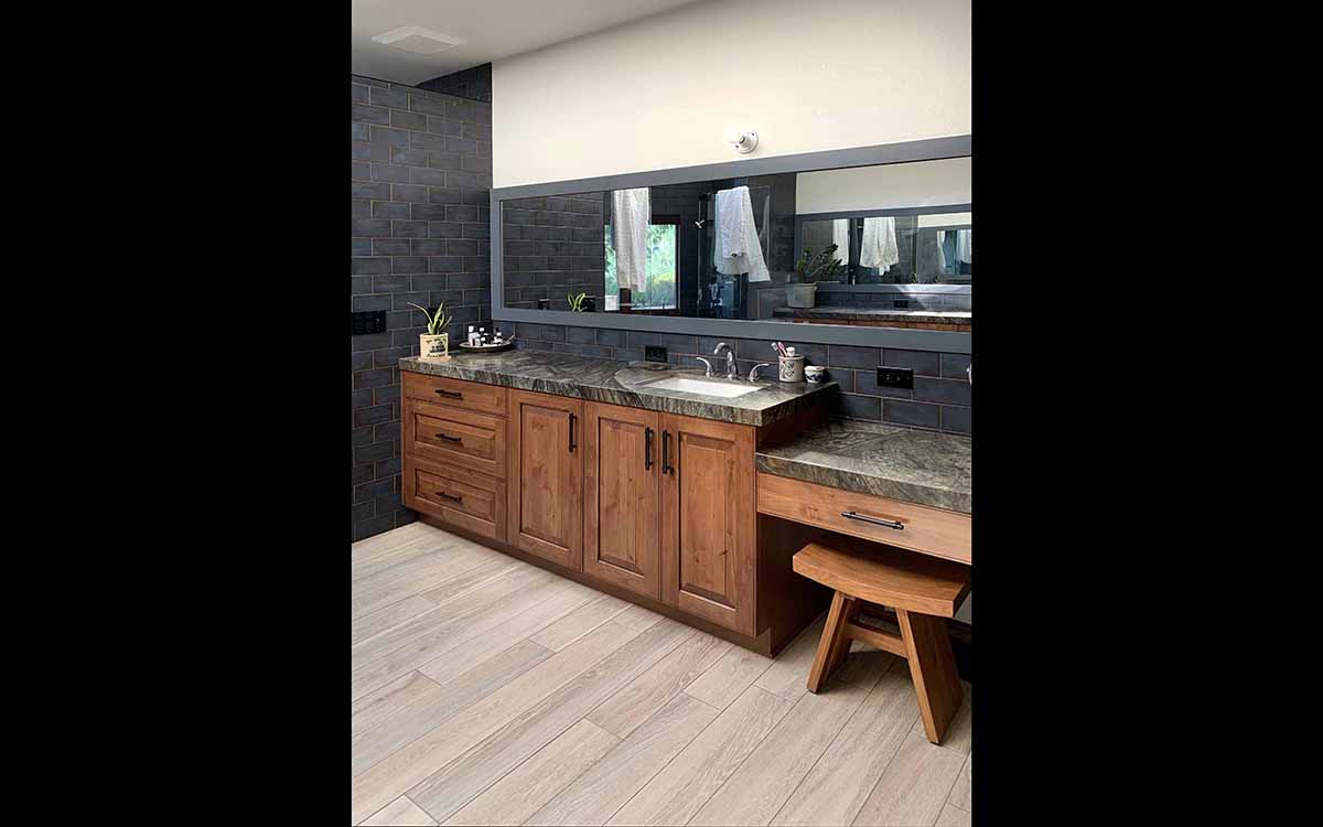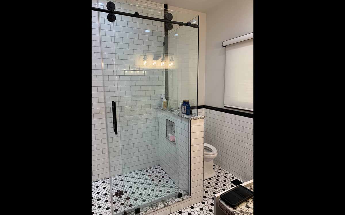 This renovation has a Traditional Style with a Mountain Rustic flair. The granite and cabinet wood tones blend together for a warm and elegant look. The Guest Bath has an European style with a bit of Industrial feel. We created this by using black and white marble mosaic tiles on the floor with classic white subway tile for the shower walls. We added accents including black hardware and a barn door slider help to give the space and industrial theme.