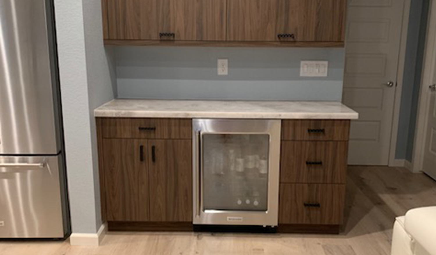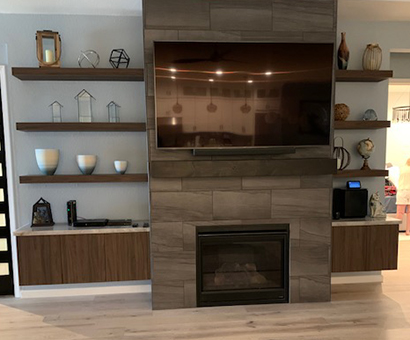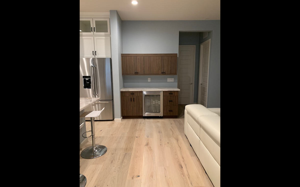 The cabinets are vertical grain walnut looking laminate which gives the clean but rich feel of wood. The modern flat panel doors along with the floating shelves and base cabinets are used to complete the mid-century theme.