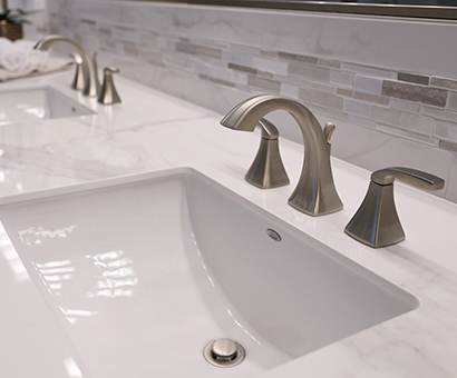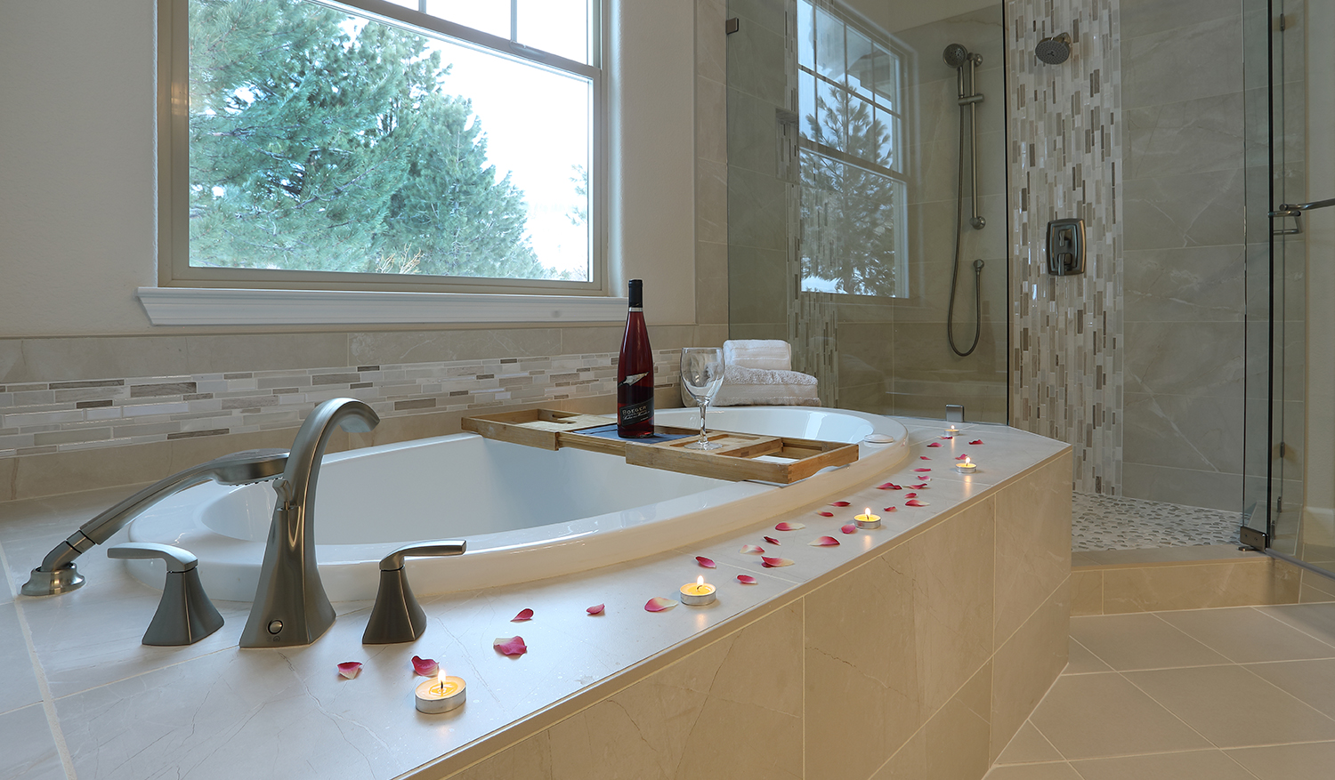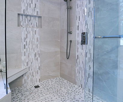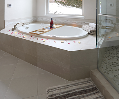 This spa-like bathroom is designed using soothing neutral colors along with elegant marble & glass mosaics and ceramic tiles throughout the shower and tub surround. The rich cherry wood vanity cabinets are finished with a sophisticated porcelain which completes the luxurious space.